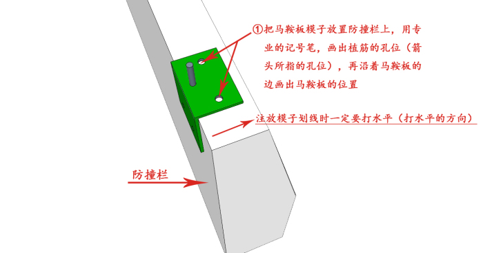 ①把馬鞍板模子放置防撞欄上,用專業(yè)的記號筆,畫出植筋的孔位(箭頭所指的孔位),再沿著馬鞍板的邊畫出馬鞍板的位置 ②依次按照2500mm(如圖所示)的間隔做好標(biāo)記 ③按照放樣的孔線位置把植筋打進去,一定要對準(zhǔn)位置打孔 ④將立柱(立柱和馬鞍板在工廠以焊接完成)放置防撞墻上,注意將立柱植筋孔套在打下的植筋中,將立柱扶好調(diào)整好位置......